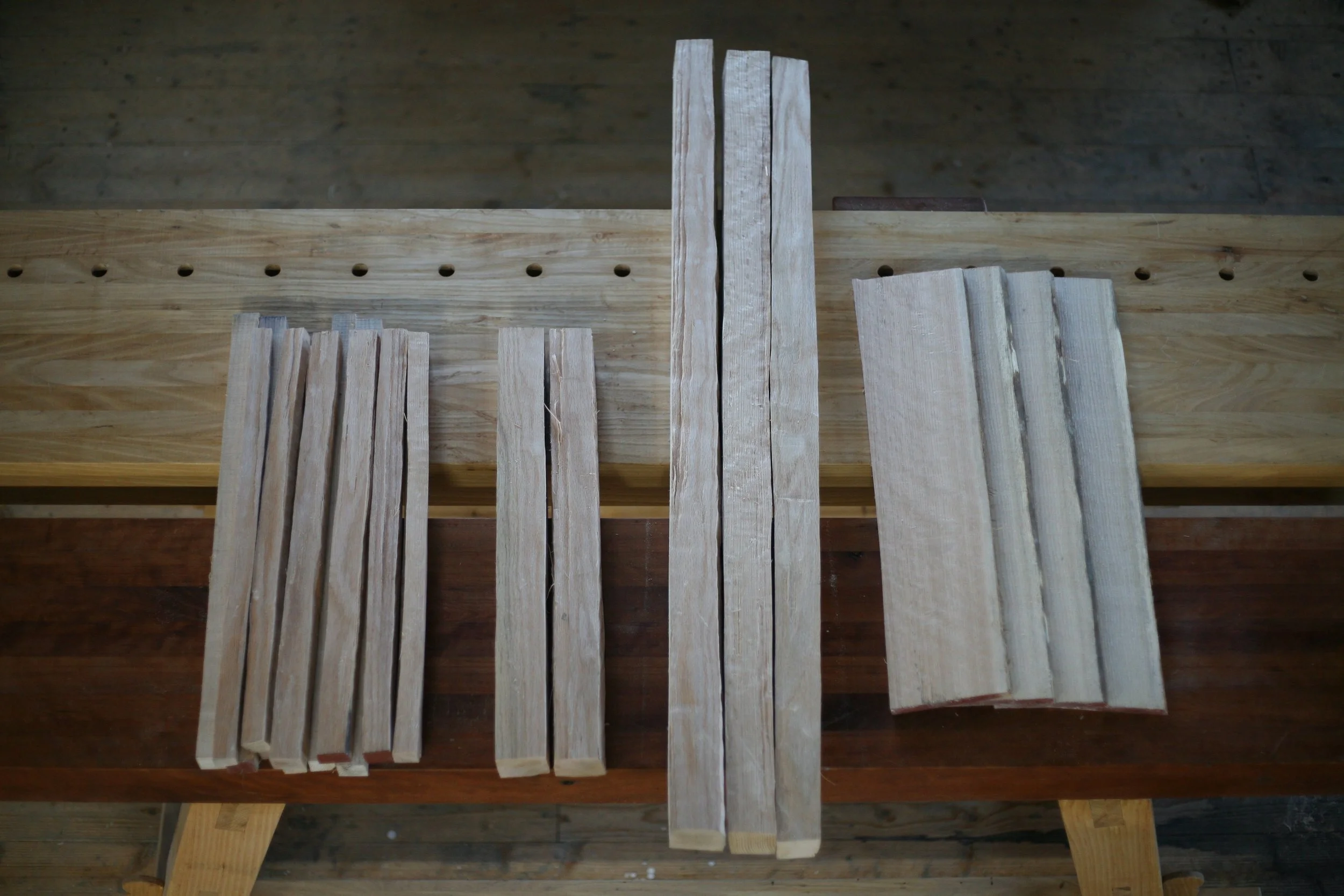 Available: red oak ladder back chair kits and extra parts (green wood, straight from the log, with the ends sealed to slow the drying process). Parts sized to fit 2- or 3-slat ladder back side chairs. Ideal for anyone interested in making their own chairs.